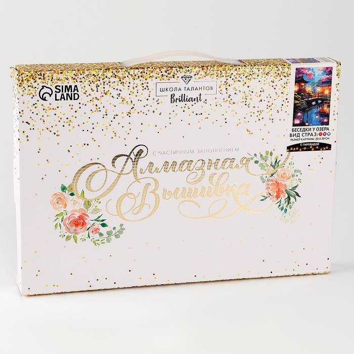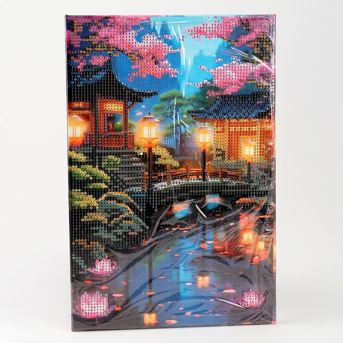 Алмазная мозаика с частичным заполнением на подрамнике «Беседки у озера», 20 х 30 см, с гирляндой