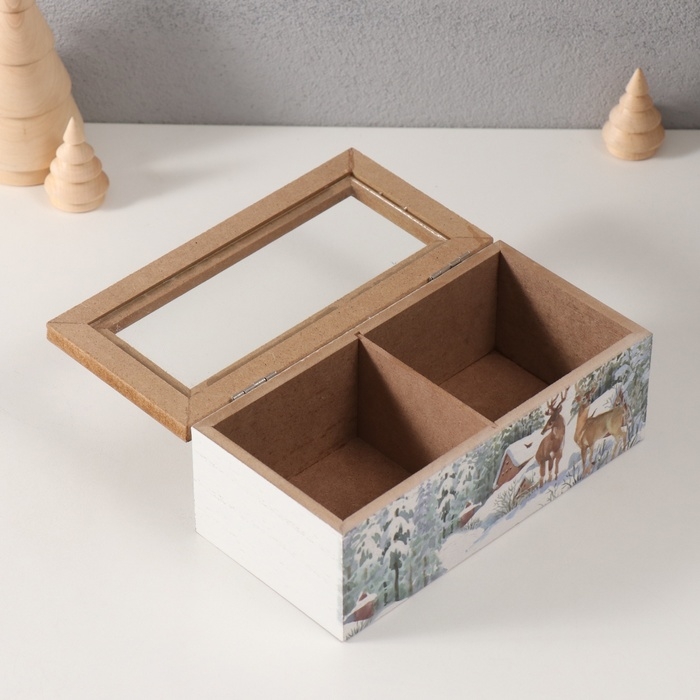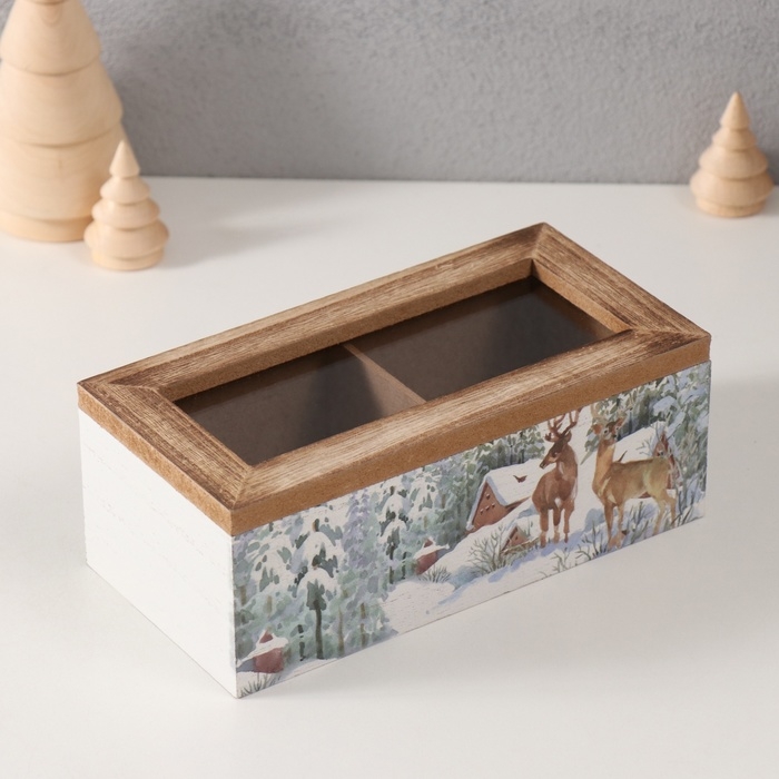 Шкатулка дерево 2 деления "Олени у заснеженного домика" 9,2х18х7 см