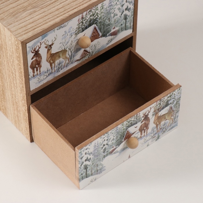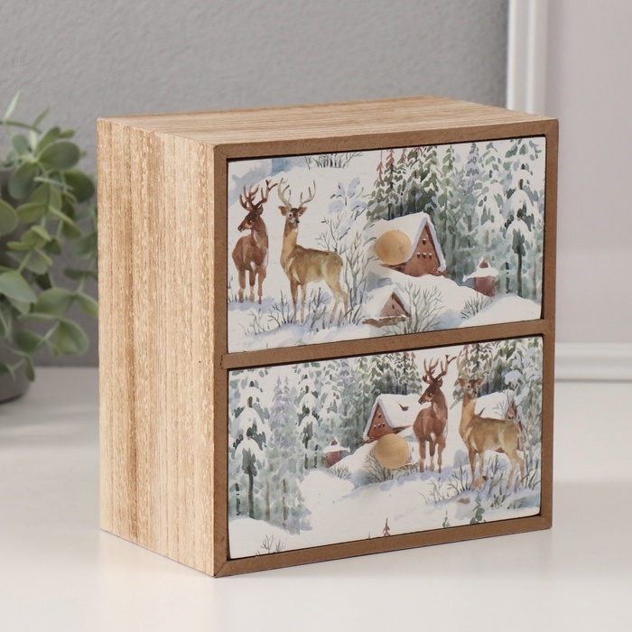 Шкатулка дерево 2 ящика "Олени у заснеженного домика" 10,2х17,2х17,6 см