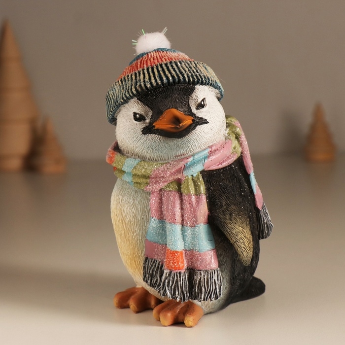 Сувенир полистоун "Сердитый пингвин в шапке с бомбошкой, в цветном шарфе" 9,5х9,5х12,5 см