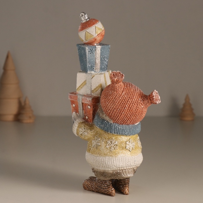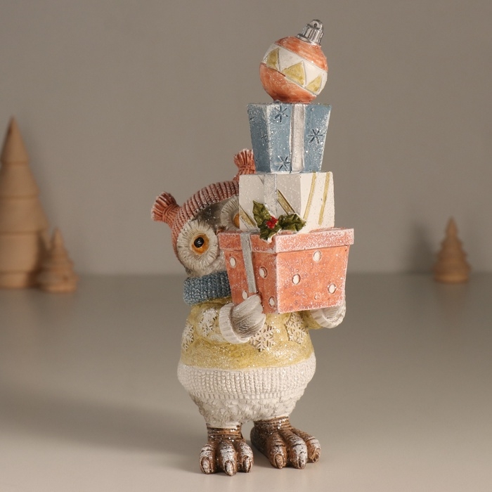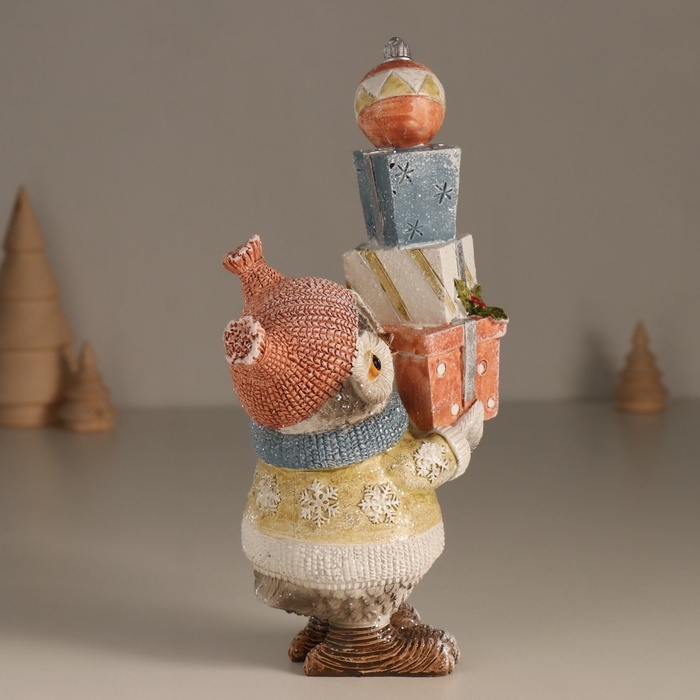 Сувенир полистоун "Совушка в платье со снежинками, с горой подарков" 13,6х8х20,5 см