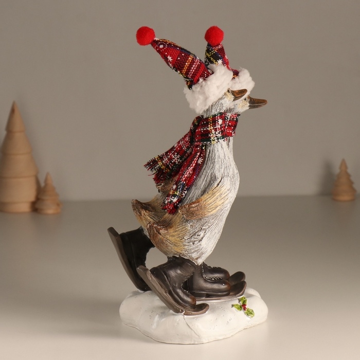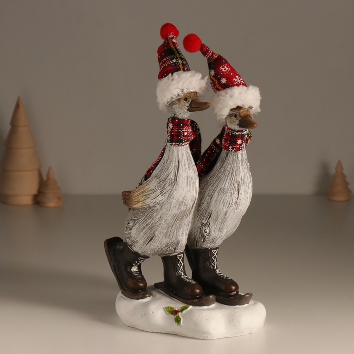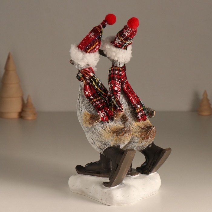 Сувенир полистоун "Гуси в колпаках, вязаных шарфах, на мини-лыжах" 12х15х22,5 см