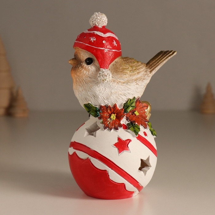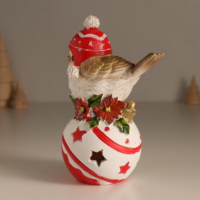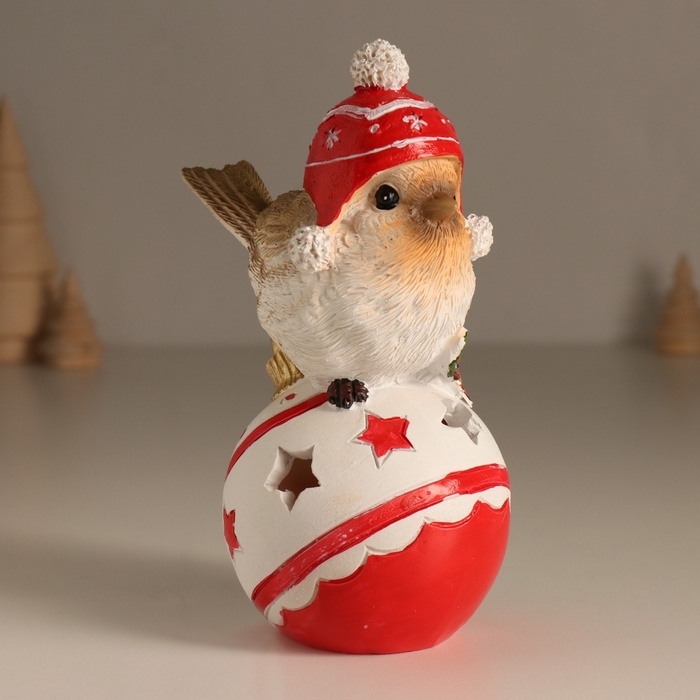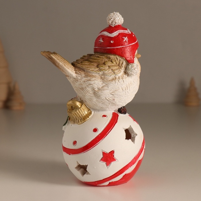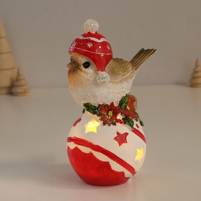 Сувенир полистоун свет "Птичка в шапке с помпонами на ёлочном шарике" 7,5х9,5х15 см