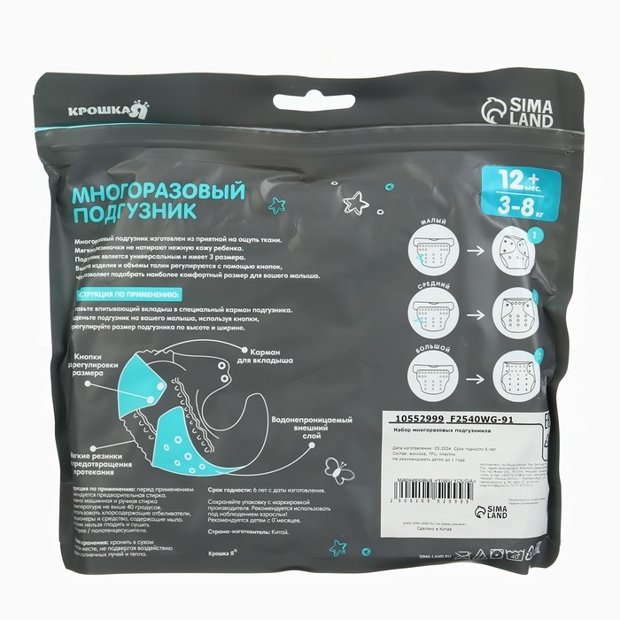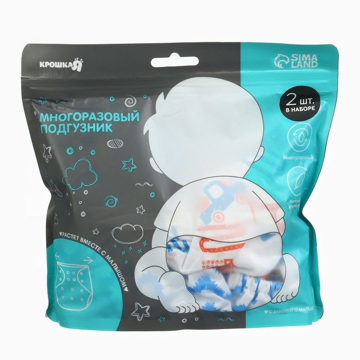Набор многоразовых подгузников «Машинки», 3-8 кг, цвет белый, голубой, 2 шт., Крошка Я