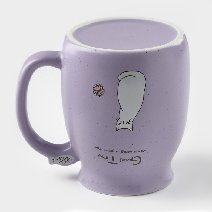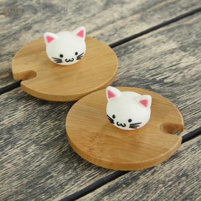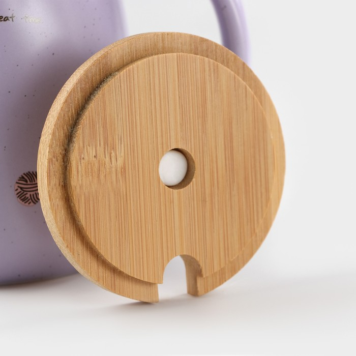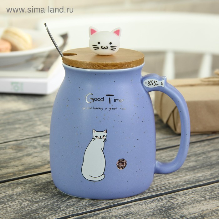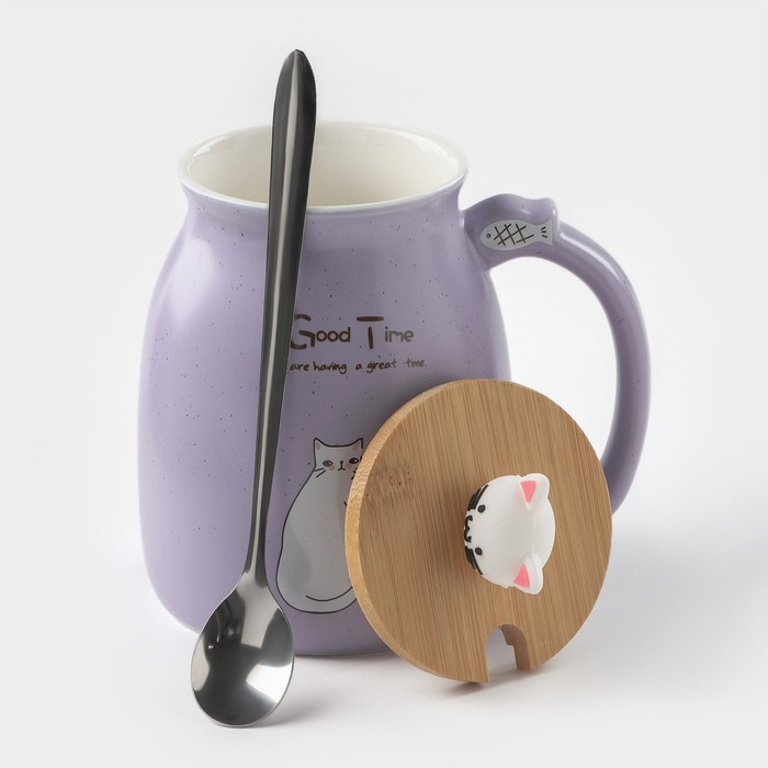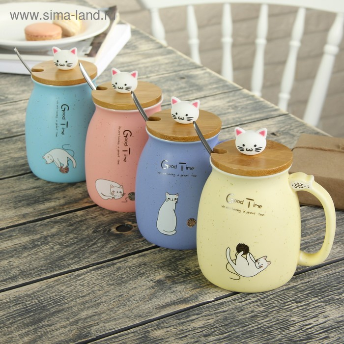 Кружка керамическая с деревянной крышкой и ложкой «Котик», 500 мл, цвет и рисунок МИКС