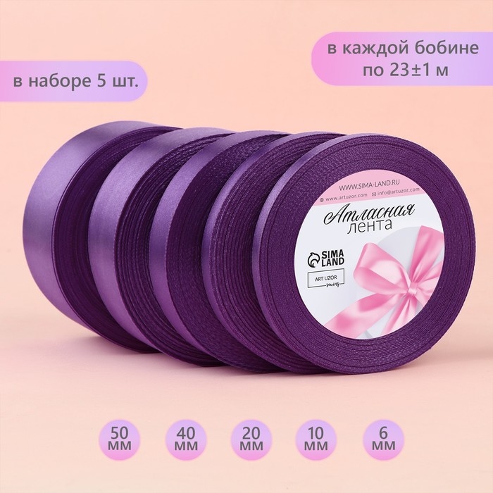 Набор атласных лент, 5 шт, размер лент: 6/10/20/40/50 мм × 23 ± 1 м, цвет фиолетовый