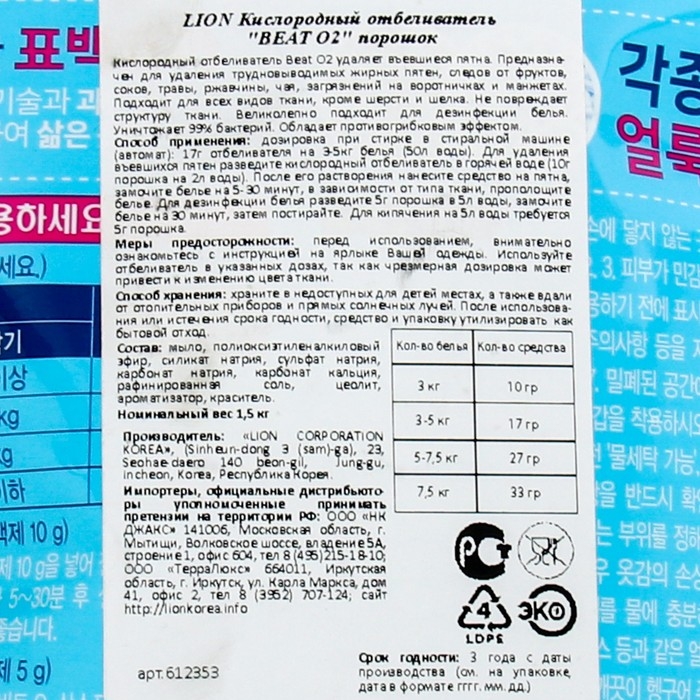 Кислородный отбеливатель Beat O2, порошок, дой-пак, 1.5 кг