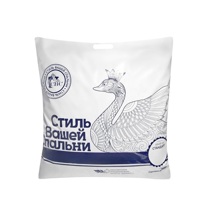 Ткань верха: пуходержащий хлопковый тик. Наполнитель: пухоперовая смесь (пух — 30 %, перо — 70 %). Кант: х/б, атласная этикетка-уголок с логотипом «СВС» на сатине. Поставляется в фирменном пакете с ручкой.