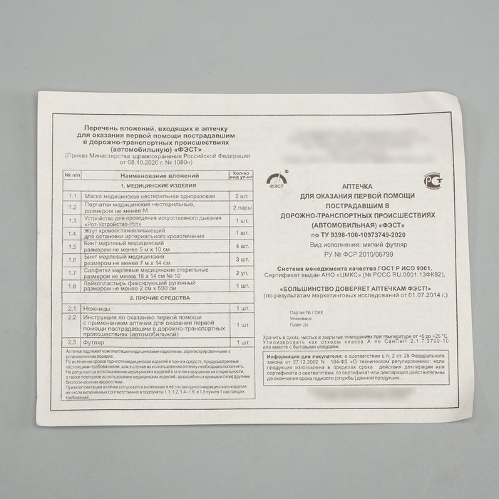 Автомобильная аптечка первой помощи "ФЭСТ" состав 2024, мягкий футляр