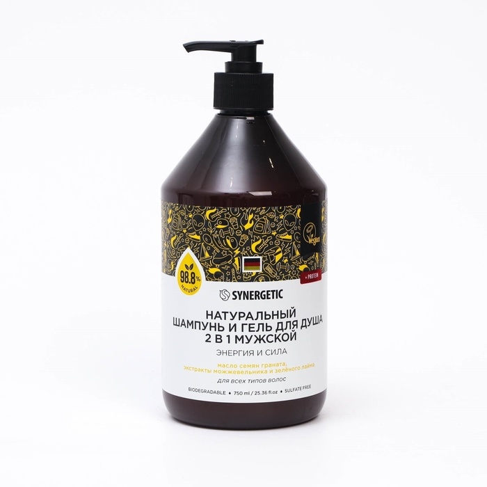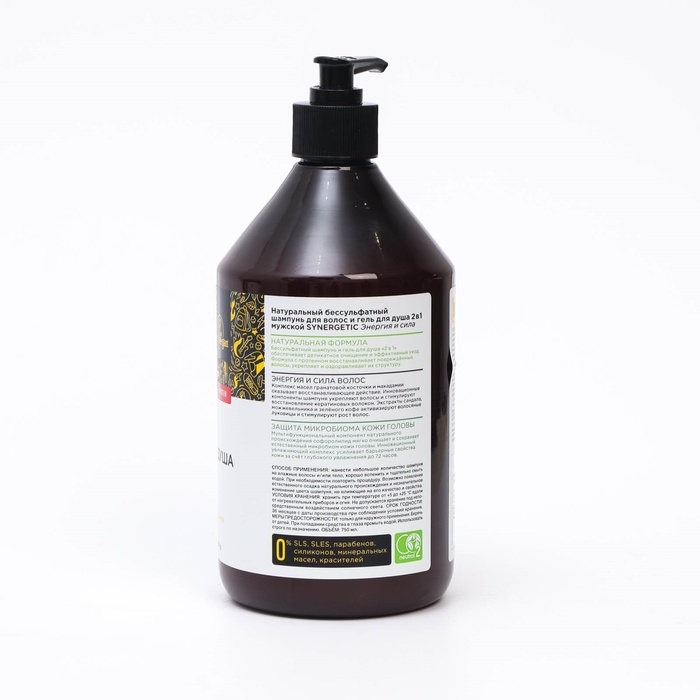 Шампунь и гель для душа мужской бессульфатный SYNERGETIC энергия и сила, 750 мл