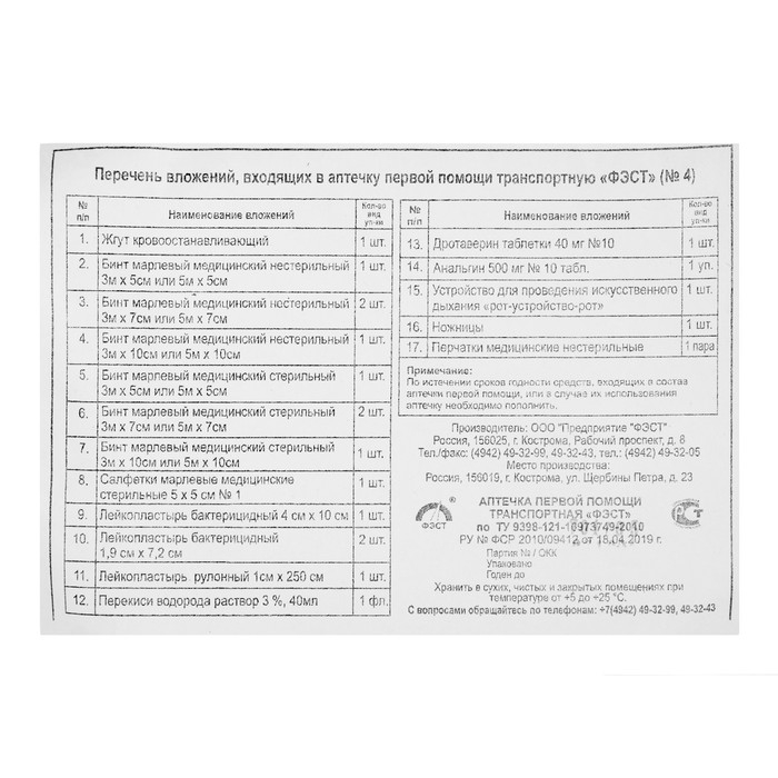 Аптечка первой помощи транспортная "ФЭСТ", перечень №2
