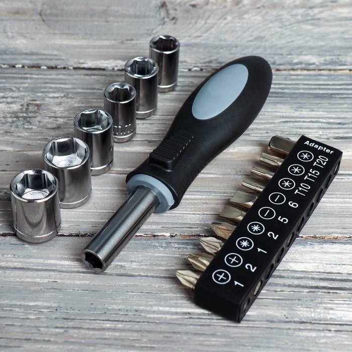 Адаптер, Биты, Отвёртка, Открывашка, Рукоять отвертки, Рулетка, Торцевая головка, Фонарик, Шестигранник