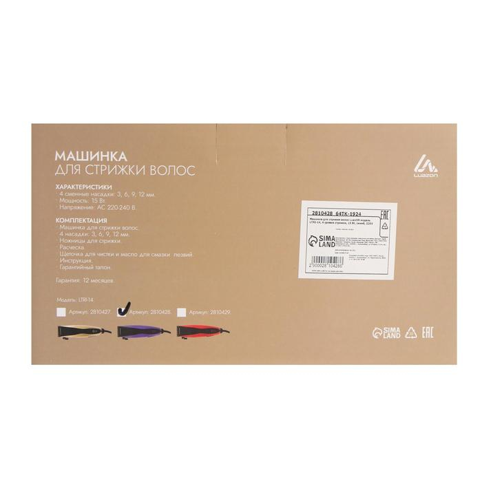 Машинка для стрижки Luazon LTRI-14, 15 Вт, 3/6/9/12 мм, 220 В, синяя