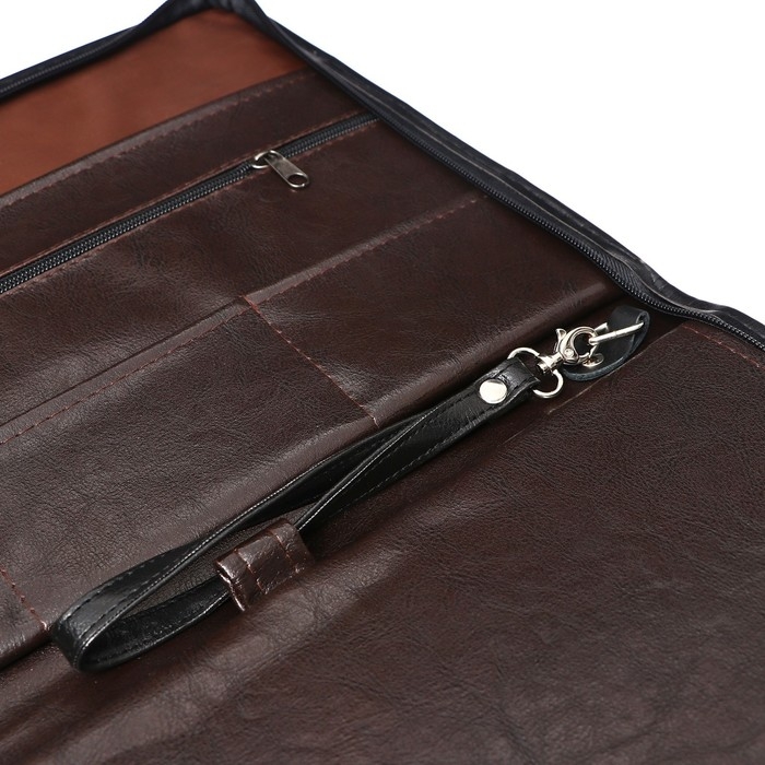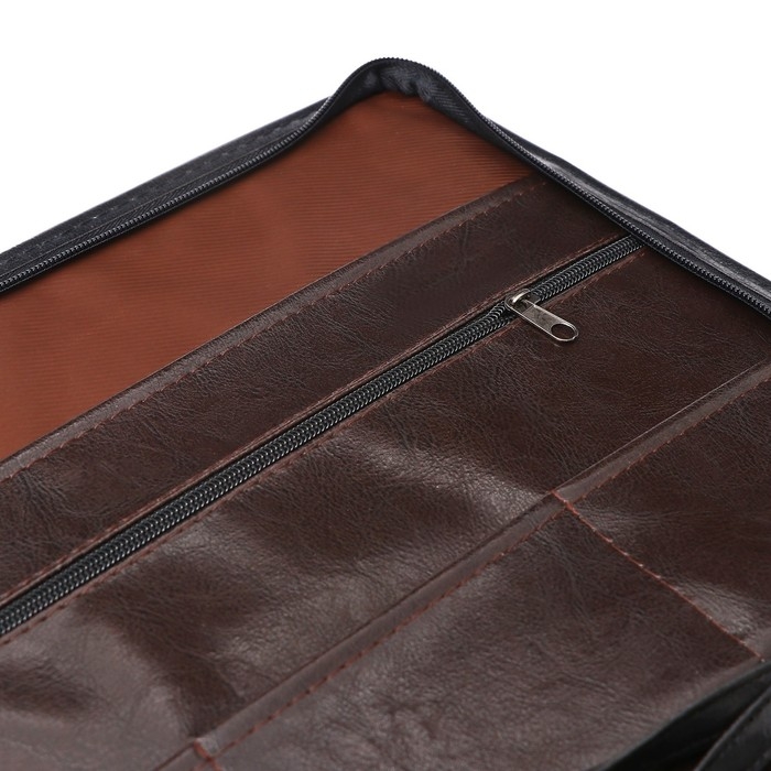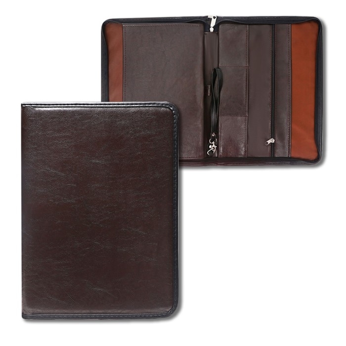Представительная деловая папка на молнии.Изготовлена из черного К/З Люкс.Размер изделия 275 на 370 мм. Толщина папки 30 мм.Внутри расположено удобных, вместительных 2 кармана плюс карман на молнии и 3 кармашка под визитки.Удобная ручка в виде петли.