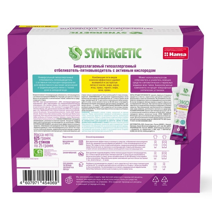 Биоразлагаемый гипоаллергенный пятновыводитель-отбеливатель с активным кислородом SYNERGETIC в стиках - универсальное средство для эффективного удаления загрязнений и трудновыводимых пятен с тканей даже в холодной воде.