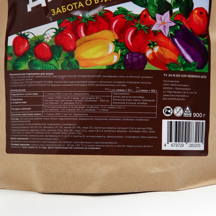 К концу дачного сезона очень важно позаботиться об отплодоносивших многолетниках и о земле, взрастившей урожай, отдавшей на это много полезных элементов.Восполнить истраченное поможет «УДОБРЯША для осени» - удобрение, которое нужно вносить под деревья и кустарники, а также при перекопке грядок.Бонус! «УДОБРЯШУ для осени» можно использовать для дозревания урожая (поздние томаты, яблоки и груши, ремонтантные сорта клубники и малины, тыква, корнеплоды и пр.).«УДОБРЯША» содержит в идеальных пропорциях 18 важнейших восстанавливающих плодородие элементов, полезные почвенные бактерии, витамины и аминокислоты.Особый компонент состава - ВОДОРОСЛЬ СПИРУЛИНА.Спирулина входит в список самых полезных продуктов в мире!Эта водоросль - кладезь полезных компонентов. Она содержит:· растительный белок,· 11 микроэлементов, включая редчайший селен (Se), обеспечивающий растениям двойную стрессоустойчивость,· хлорофилл,· бета-каротин,· все важнейшие аминокислоты и витамины. Полезные свойства подкормки «УДОБРЯША для осени»:• ПОВЫШАЕТ ПЛОДОРОДИЕ ПОЧВЫ, полностью подготавливая с осени грядки к весенним посадкам огородных культур.• ДЛЯ МНОГОЛЕТНИКОВ - УСИЛИВАЕТ МОРОЗОСТОЙКОСТЬ и ОБЕСПЕЧИВАЕТ ЗАПАСОМ ПИТАНИЯ до весны.• ГАРАНТИРУЕТ ЭКОЛОГИЧНОСТЬ урожаев благодаря 100% органическому составу.Состав: костная мука, рыбная мука, жмых подсолнечника, водоросль спирулина, комплекс полезных почвенных микроорганизмов.Химический состав компонентов удобрения:· Макроэлементы: азот (N) 2%, фосфор (P) 7%, калий (К) 9%, сера (S), хелатные формы кальция (Ca) и магния (Mg);· Микроэлементы: марганец (Mn), железо (Fe), бор (B), медь (Cu), цинк (Zn) в хелатных формах, молибден (Mo), хром (Cr), йод (J), фтор (F), кобальт (Co), натрий (Na), селен (Se);А также комплекс аминокислот, витамины А, С, Д, Е и группы B, антиоксиданты, фикоцианин, хлорофилл, бета-каротин.