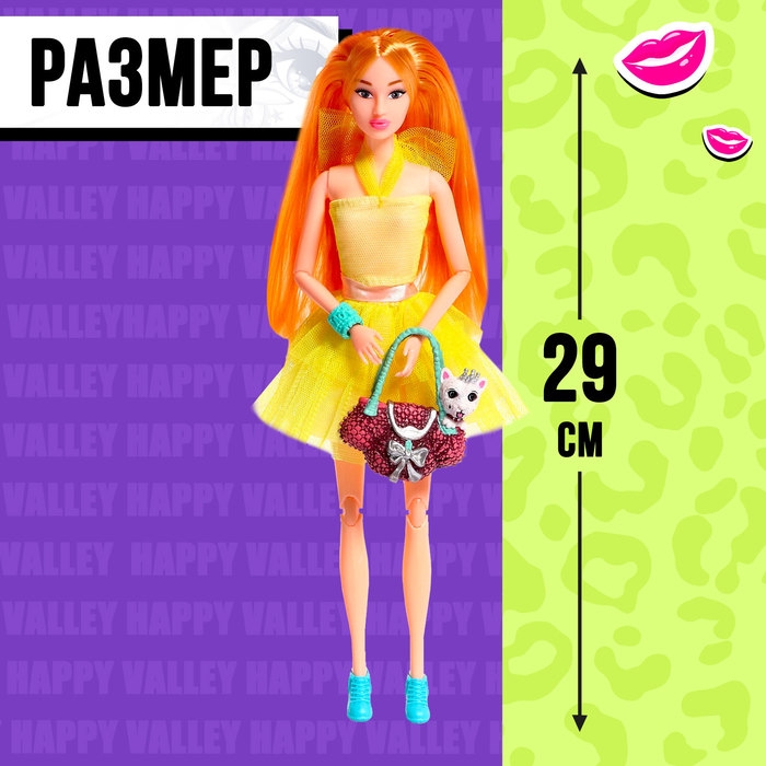 - Высота куклы: 29 см. У неё изящная фигурка, шарнирные соединения в локтях, кистях, коленях, подвижные плечи и бёдра. Эта маленькая модница будто создана для модных показов и головокружительных фотосессий!