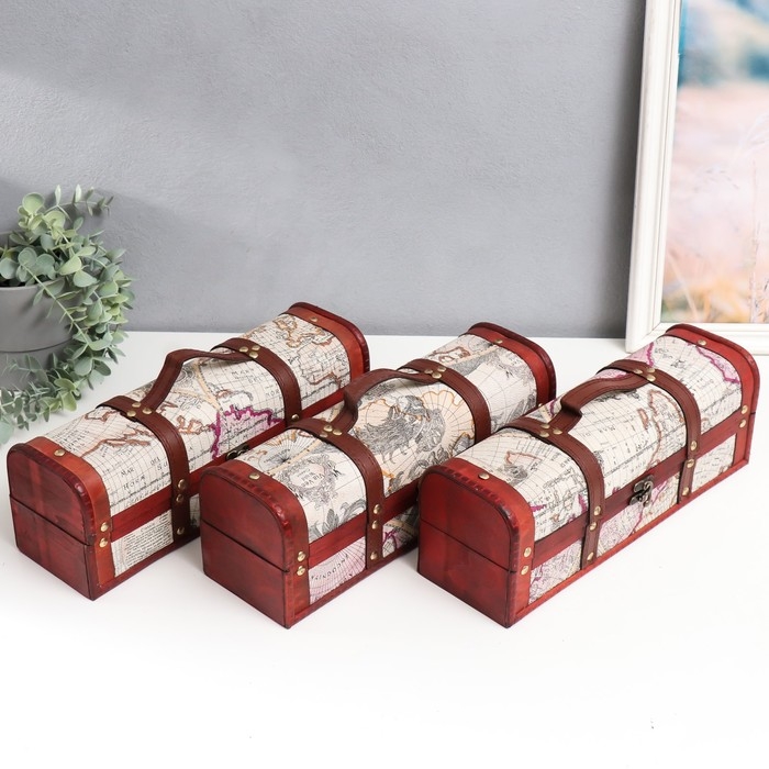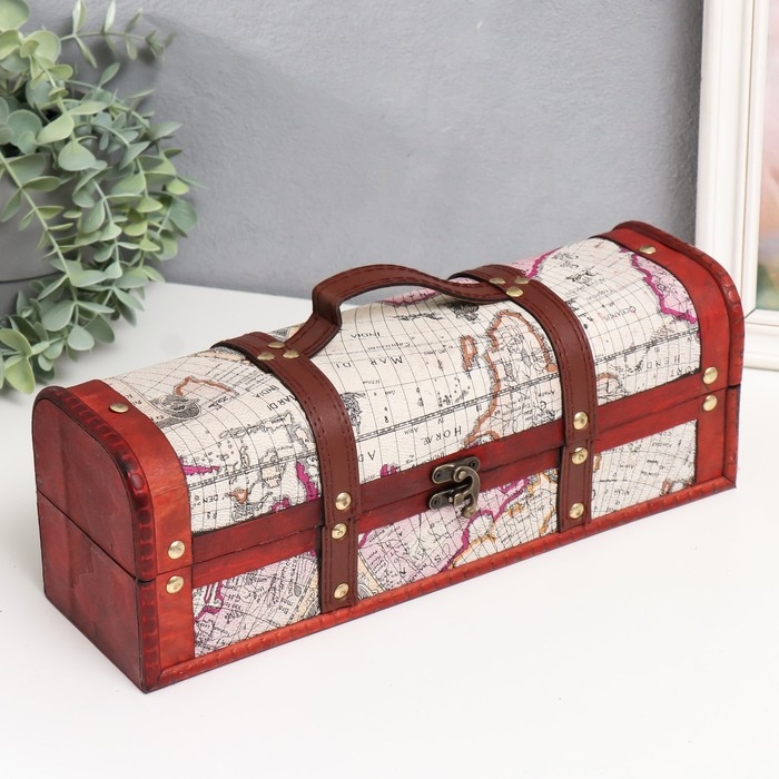 Шкатулка под бутылку "География" 33,5х11х12 см МИКС выполнена из дерева, её форма напоминает сундук XVII века. Кажется, что если её открыть, Вас окинет блеск золотых сокровищ великой императрицы. Прекрасная вещь, которая пригодится любой даме, ведь туда можно поместить не только украшения, но и различные мелочи, вроде принадлежностей для шитья. Шкатулка, которая пригодится в обиходе любой женщины.