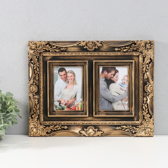 Фоторамка пластик на 2 фото 10х15 см "Герб ажурный" под бронзу 40х30,5 см - казалось бы, небольшой сувенир, который напомнит о счастливых днях, проведенных наедине друг с другом, с семьей, а также украсит домашний интерьер, придавая ему тот неповторимый уют, который возможен только в доме, где царят гармония и любовь. Она станет замечательным подарком на 14 февраля, годовщину или в другой значимый для Вас день, чтобы просто порадовать свою вторую половинку.