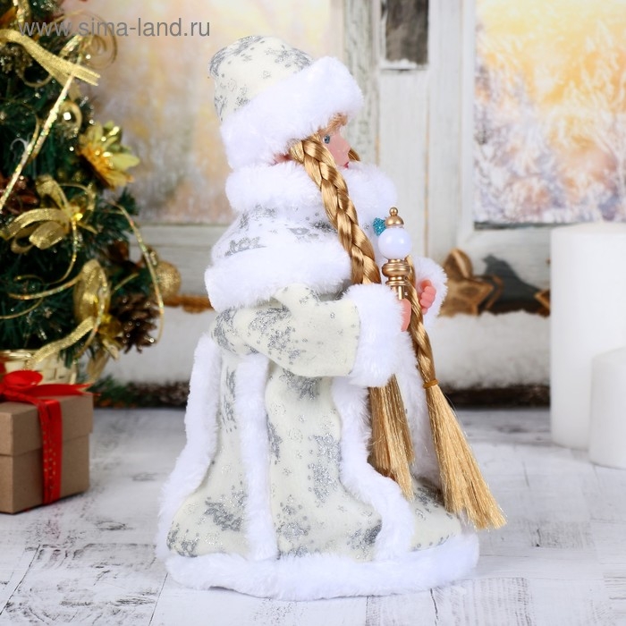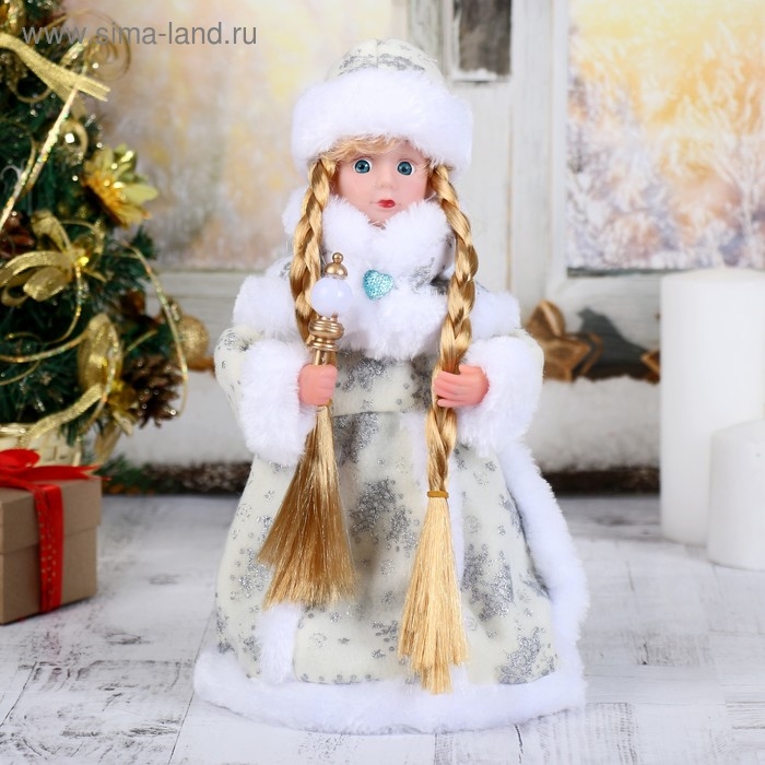 Снегурочка "Белая шубка, с посохом и синей пуговкой" двигается, 31 см
