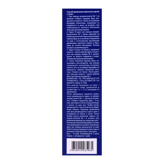 Способ применения взрослым и детям с 12 лет: при помощи насадки на флаконе №1 отобрать среднюю фазу концентрата в пипетку и нанести 1 каплю на основание бородавки (папилломы, кондиломы) по окружности и в центр, не вытирать, при необходимости наложить биогенный пластырь против растекания.