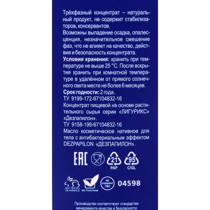 Состав: нативные концентраты кордицепса, биогенного прополиса, Rhododendron adamsii, Caragana jubata, чеснока, прополиса, чистотела, диатомовых водорослей, красного перца, топинамбура, листа брусники, семян грейпфрута, молочая, туи, шелковицы, окопника, расторопши, ореха кукуй, шиитаке, лиственничной губки, рейши, падуба, лапачо, гвоздики, пижмы, полыни, тысячелистника, зверобоя, каштана, облепихи, сока алоэ, леспедецы, уснеи, ивы, лавра, сока бузины, грушанки, живицы кедровой, нативное конопляное масло, нативное масло чайного дерева, облепиховое масло, нативное масло розмарина, нативное масло тимьяна, нативное масло орегано, нативное мумиё, нативный дёготь берёзовый, бобровая струя, Galleria mellonella, каменное масло, подмор пчелиный, пчелиное маточное молочко.