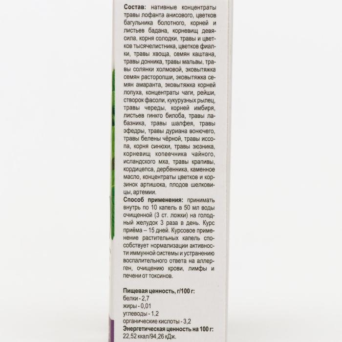 Состав: нативные концентраты травы лофанта анисового, цветков багульника болотного, корней и листьев бадана, корневищ девясила, корня солодки, травы и цветков тысячелистника, цветков фиалки, травы хвоща, семян каштана, травы донника, травы мальвы, травы солянки холмовой, эковытяжка семян расторопши, эковытяжка семян амаранта, эковытяжка корней лопуха, концентраты чаги, рейши, створок фасоли, кукурузных рылец, травы череды, корней имбиря, листьев гинкго билоба, травы лабазника, травы шалфея, травы эфедры, травы дурмана вонючего, травы белены чёрной, травы иссопа, корня синюхи, травы и цветков полыни, травы зюзника, корневищ копеечника чайного, исландского мха, травы крапивы, кордицепса, дербенника, каменное масло, нативные концентраты цветков и корзинок артишока, плодов шелковицы, артемии.