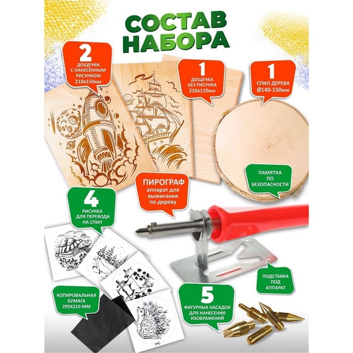 - Рисунок наносится выжигателем, а также набор входят спилы дерева и рисунки для перевода на данные спилы, что развивает художественные навыки и креативность.