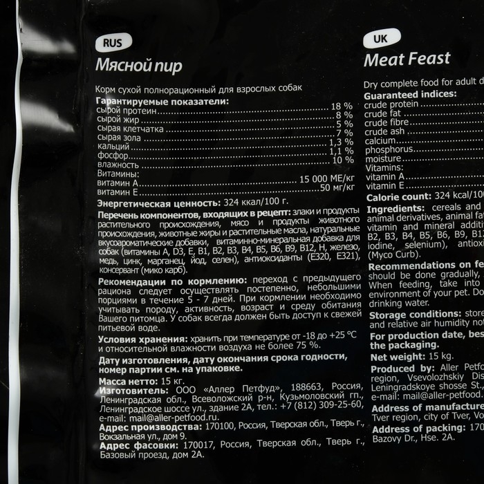 Сухой корм Tasty для собак, мясной пир, 15 кг
