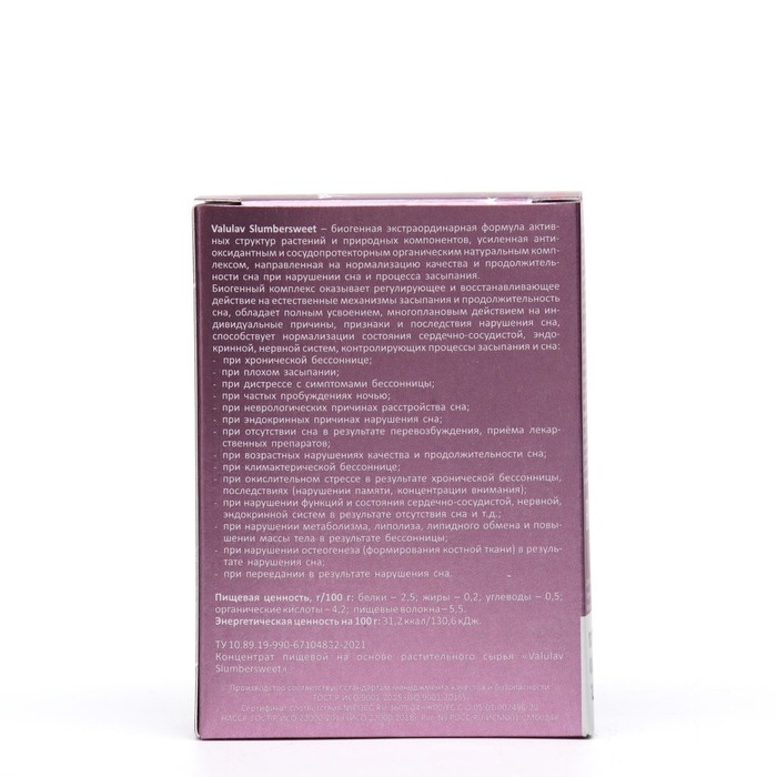 Slumbersweet при бессоннице от Valulav оказывает регулирующее и восстанавливающее действие на естественные механизмы засыпания и продолжительность сна, обладает полным усвоением, многоплановым действием на индивидуальные причины, признаки и последствия нарушения сна, способствует нормализации состояния сердечно-сосудистой, эндокринной, нервной систем, контролирующих процессы засыпания и сна.