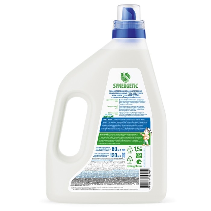 Биоразлагаемый концентрированный гель для стирки всех видов тканей SYNERGETIC UNIVERSAL с ароматом "Бескрайний океан" обеспечивает бережное и эффективное очищение тканей, гигиеническую чистоту одежды и устраняет неприятные запахи.