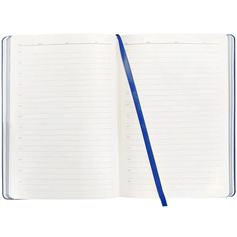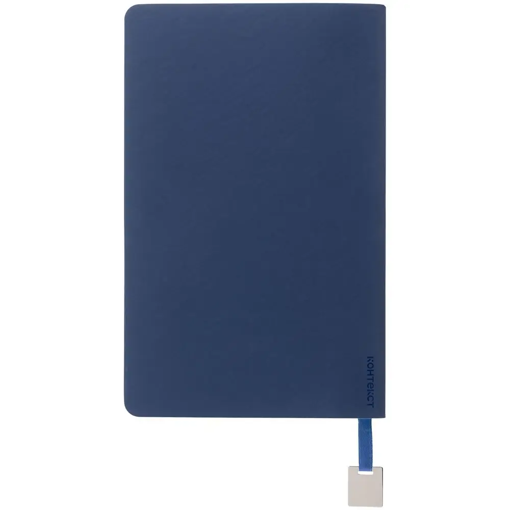 Ежедневник с гибкой обложкой, выполнен из материалов Soft Touch Pearl, синий НН, и Latte, темно-синий (внутренняя часть обложки), дополнен ляссе в цвет обложки с металлическим шильдиком.