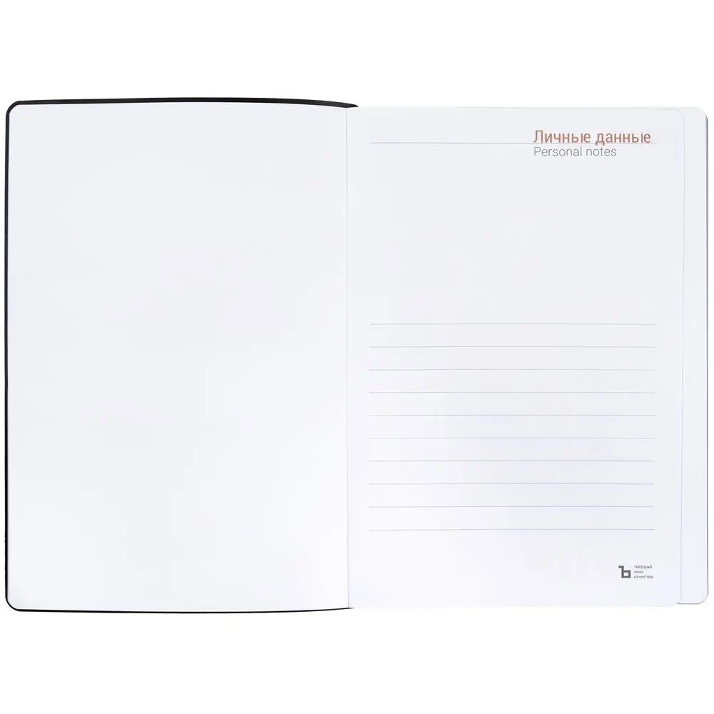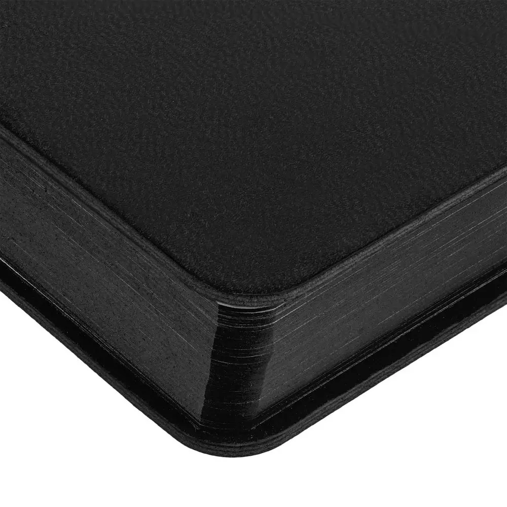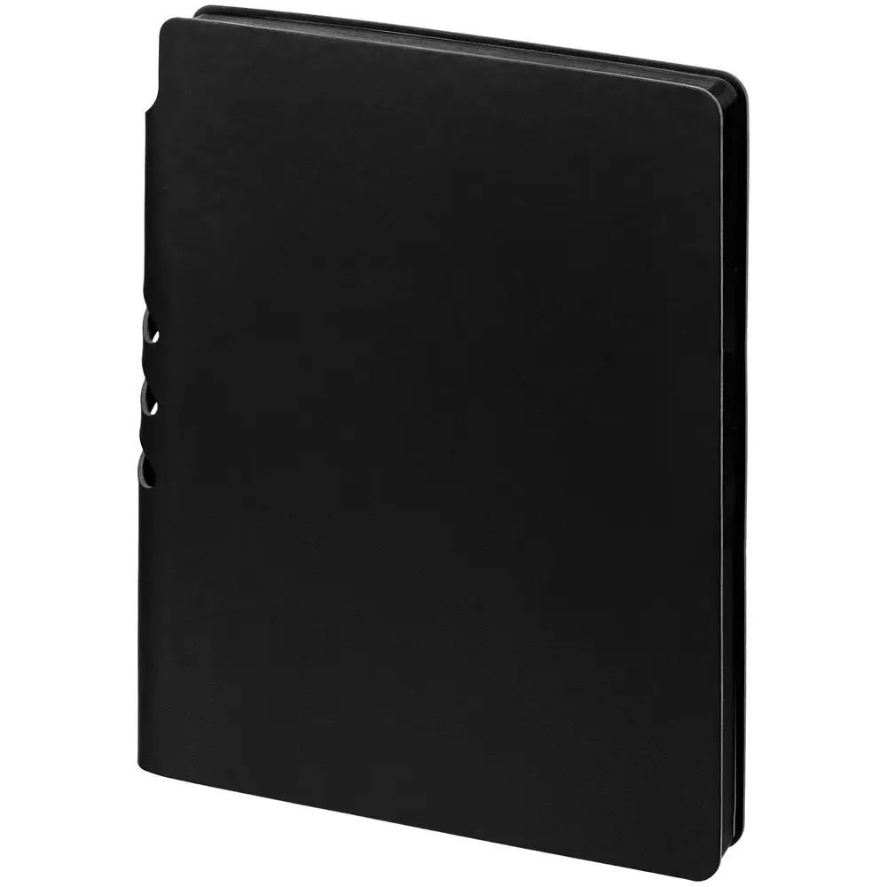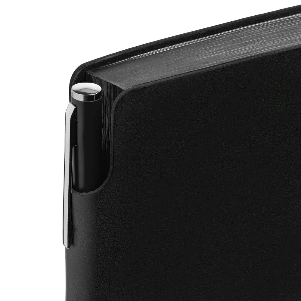 Гибкая обложка ежедневника выполнена из материала Latte, черный АА. Внутри корешка — специальное место для крепления ручки размером до 15х0,9 см.