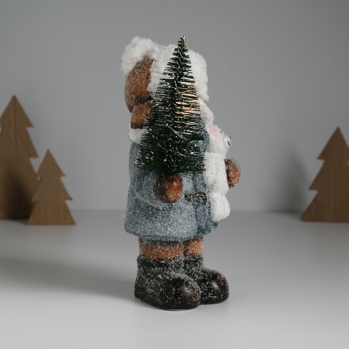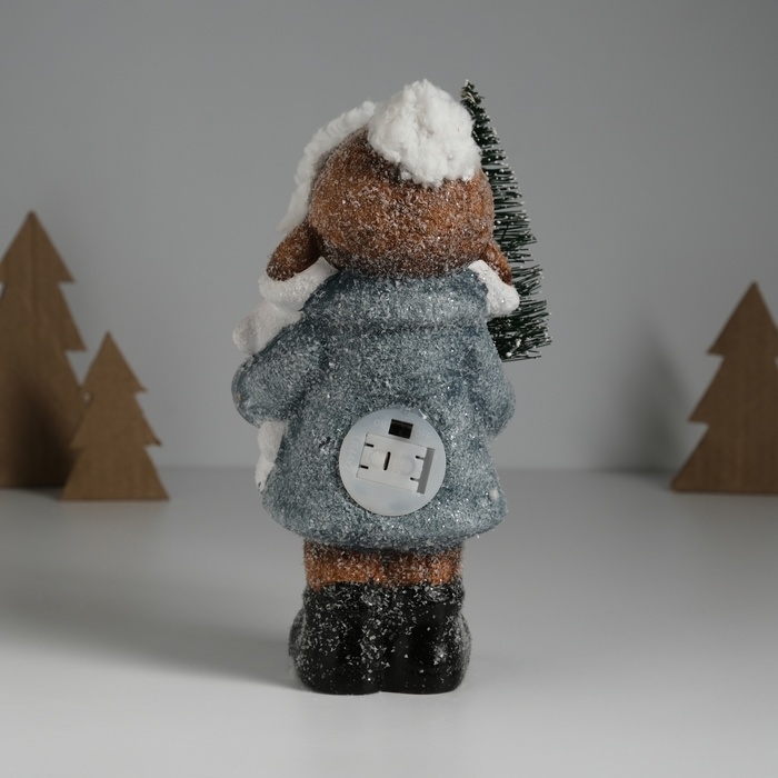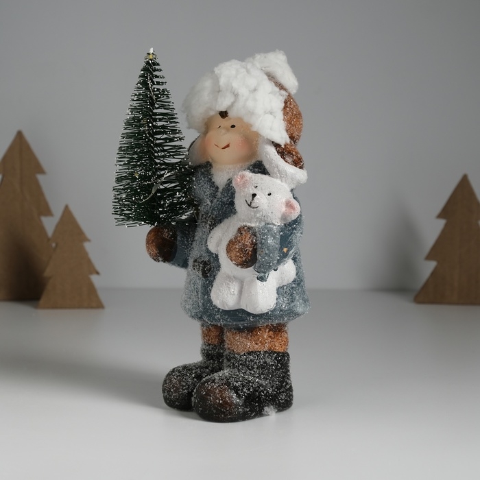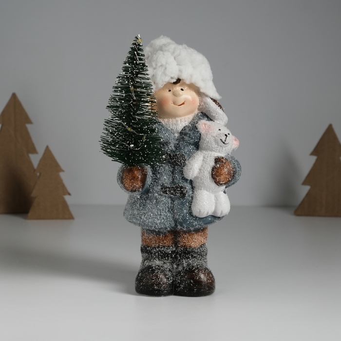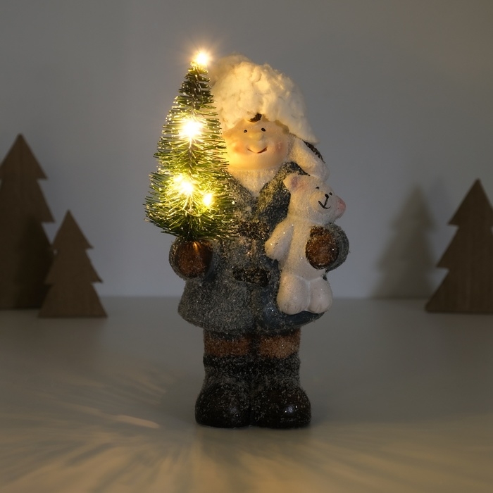 Сувенир керамика свет "Малыш в сером пальто, с ёлочкой и медведем" 10,5х8,5х19 см