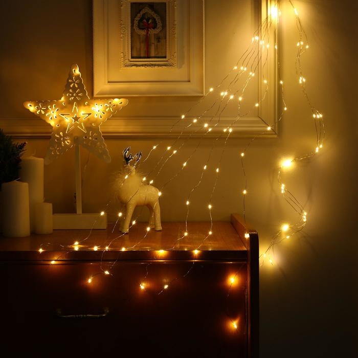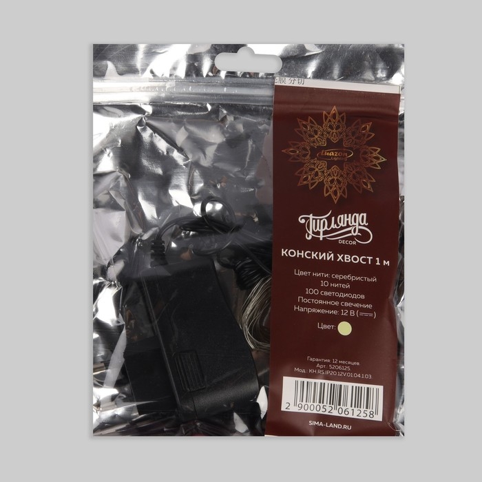 Гирлянда «Конский хвост» 10 нитей по 1 м, IP20, серебристая нить, 100 LED, свечение тёплое белое, 12 В