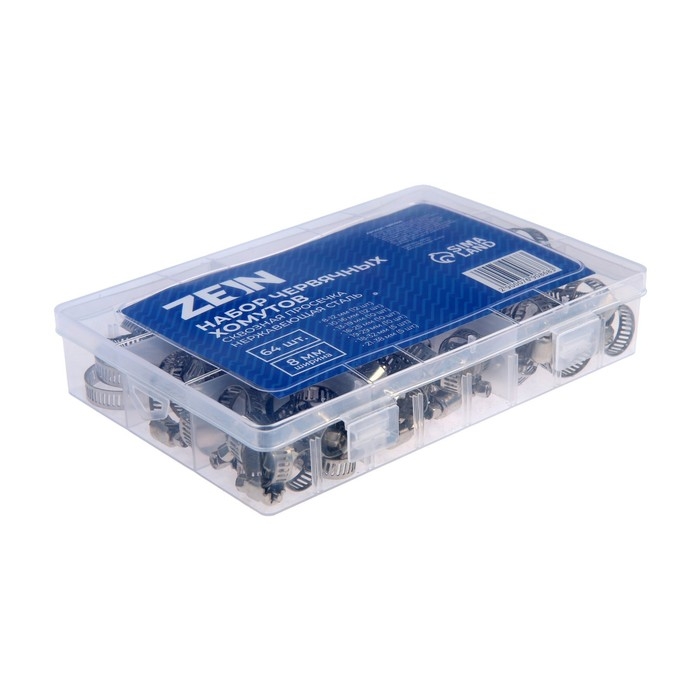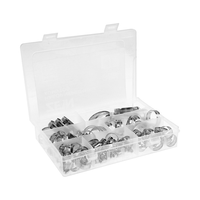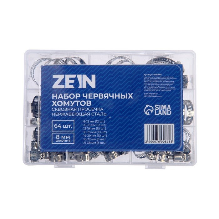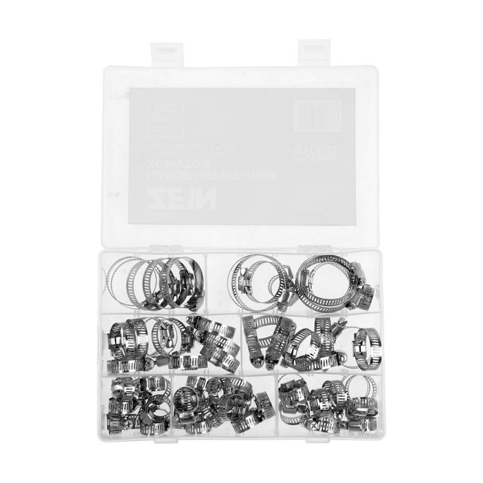 Набор червячных хомутов ZEIN engr, сквозная просечка, от 8 до 38 мм, нержав. сталь, 64 шт