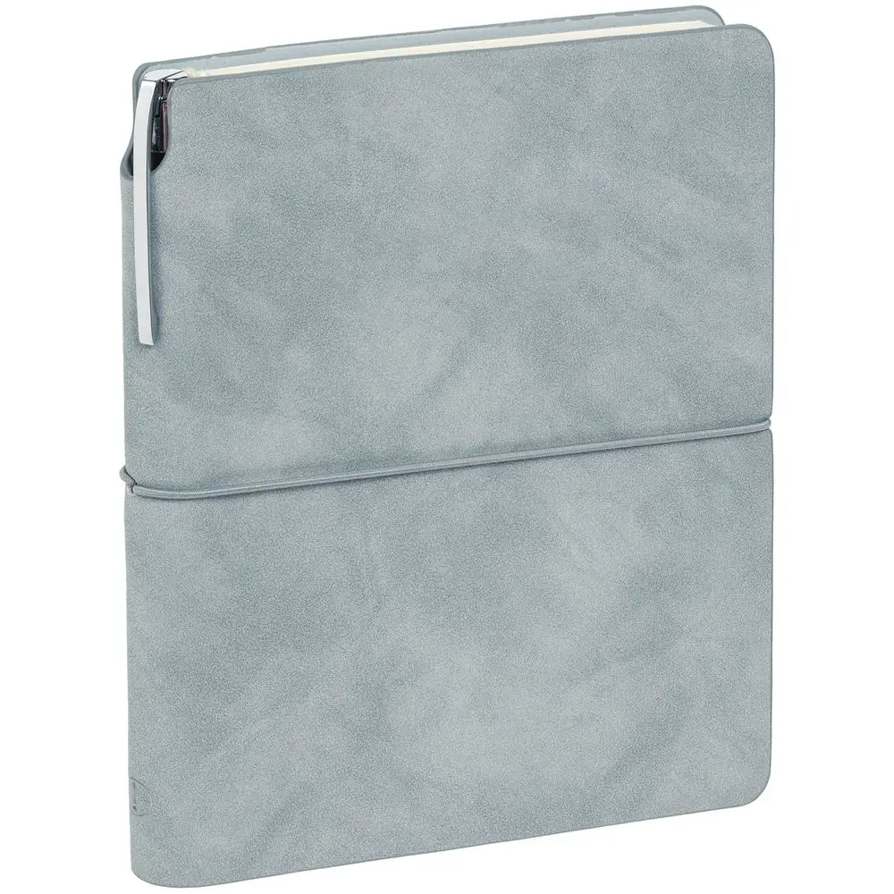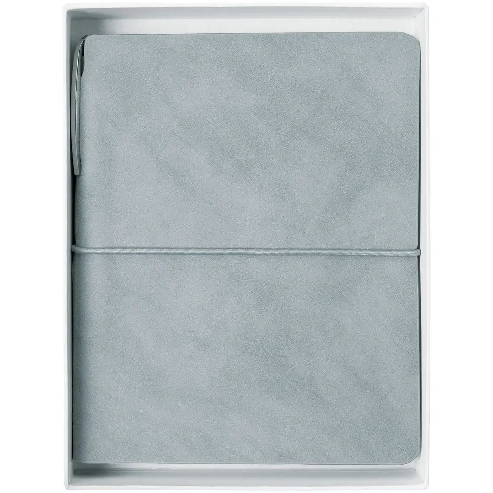 Ежедневник из искусственного материала, напоминающего замшу, и ручка с покрытием софт-тач, которая удобно прячется за обложку ежедневника.