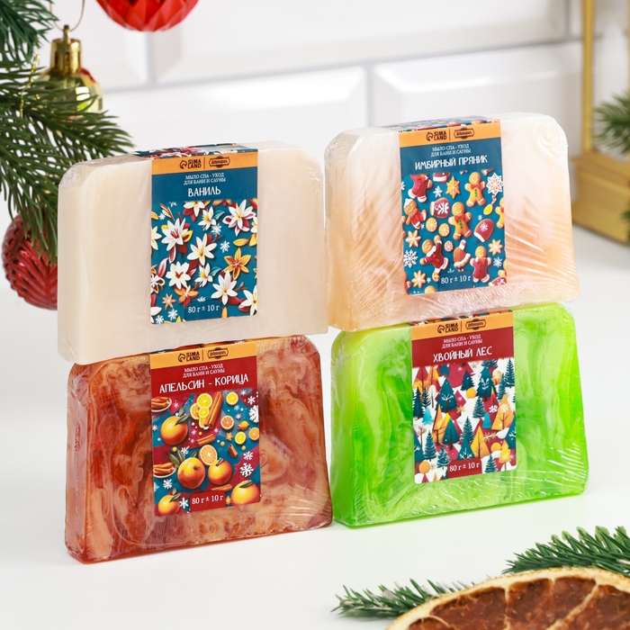 Набор мыла 4 шт "Хвойный лес, Апельсин-корица, Имбирный пряник, Ваниль" по 80 г