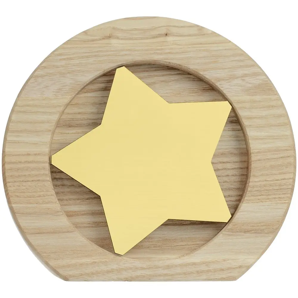 Вставка со звездой из зеркального пластика на деревянной основе крепится на приподнятое основание внутри стелы, что создает объем и многослойность награды. На вставке предусмотрен клеевой слой для крепления после нанесения.