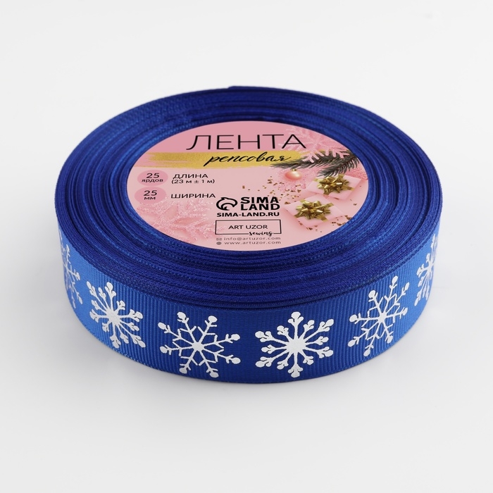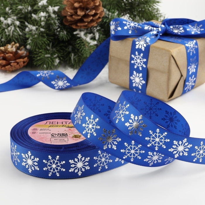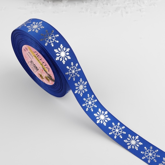 Лента репсовая с тиснением «Снежинки», 25 мм, 23 ± 1 м, цвет синий/серебряный №1240