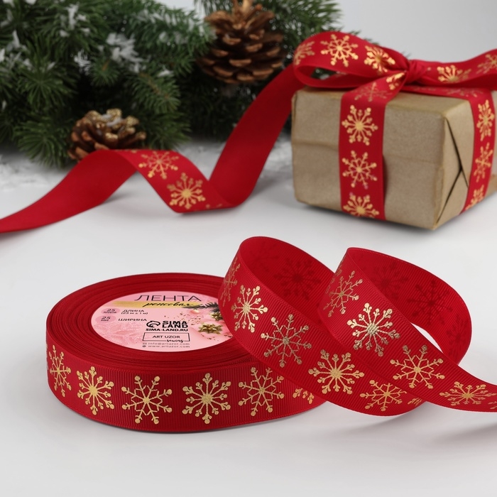 Лента репсовая с тиснением «Снежинки», 25 мм, 23 ± 1 м, цвет красный/золотой №1133