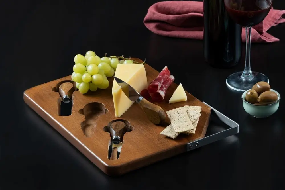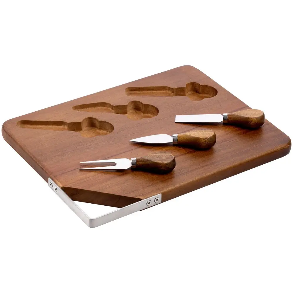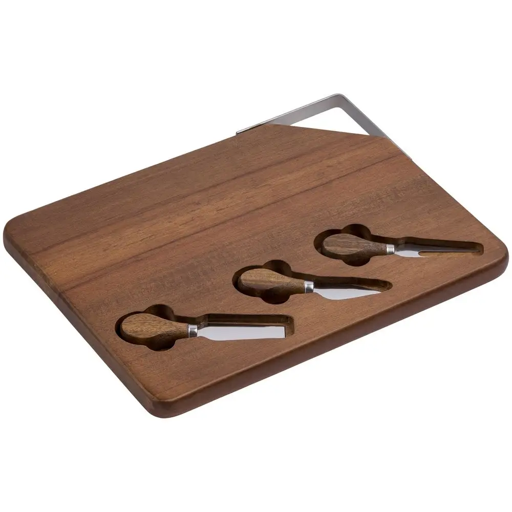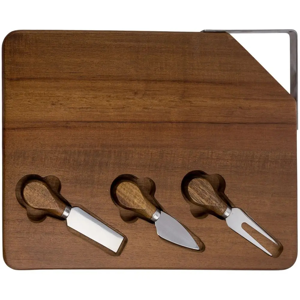 Набор для сыра пригодится как для нарезки, так и для сервировки. Доска выполнена из экологически чистого и прочного материала — древесины акации. Она обладает высокой твердостью, водоотталкивающими свойствами и не впитывает запахи. Для удобства размещения на стене в верхнем углу предусмотрен подвес из металла.В набор входят доска, вилка для сыра, нож листовидный, нож-лопатка.