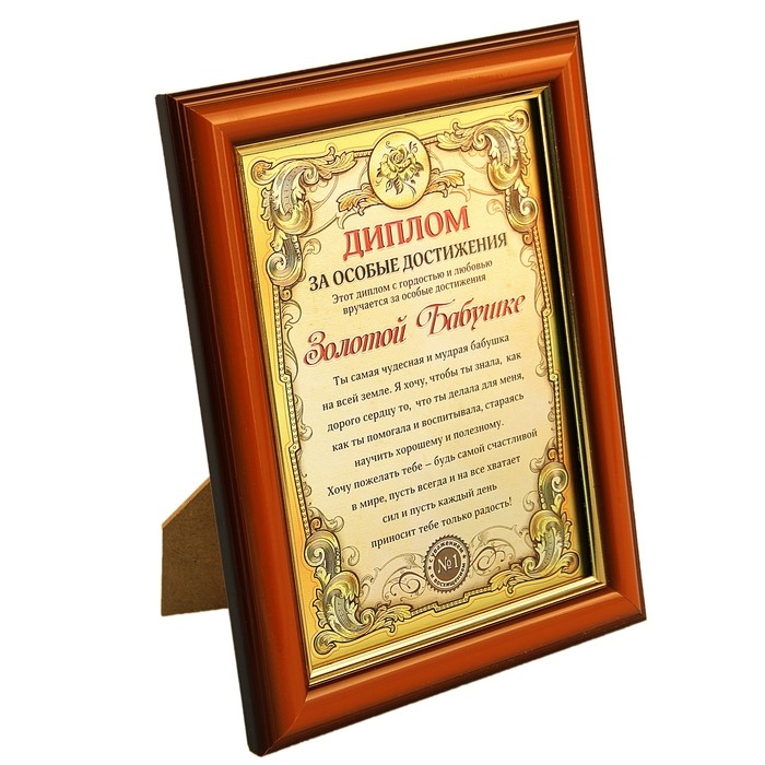 Диплом в рамке "Золотой бабушке" удобно стоит на любой горизонтальной поверхности, благодаря стандартной подставке. Упакован в картонную коробку с теплым поздравлением на обороте.