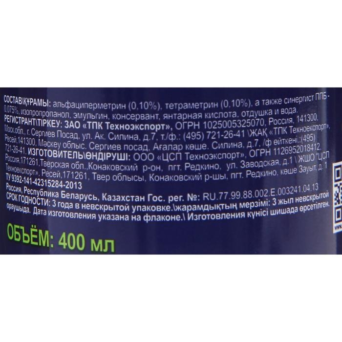 Препарат мгновенного действия для быстрого и эффективного уничтожения клопов, блох, мух (места посадки), кожеедов, тараканов, муравьев в жилых и нежилых помещениях;спрей обладает тонким запахом ромашки.