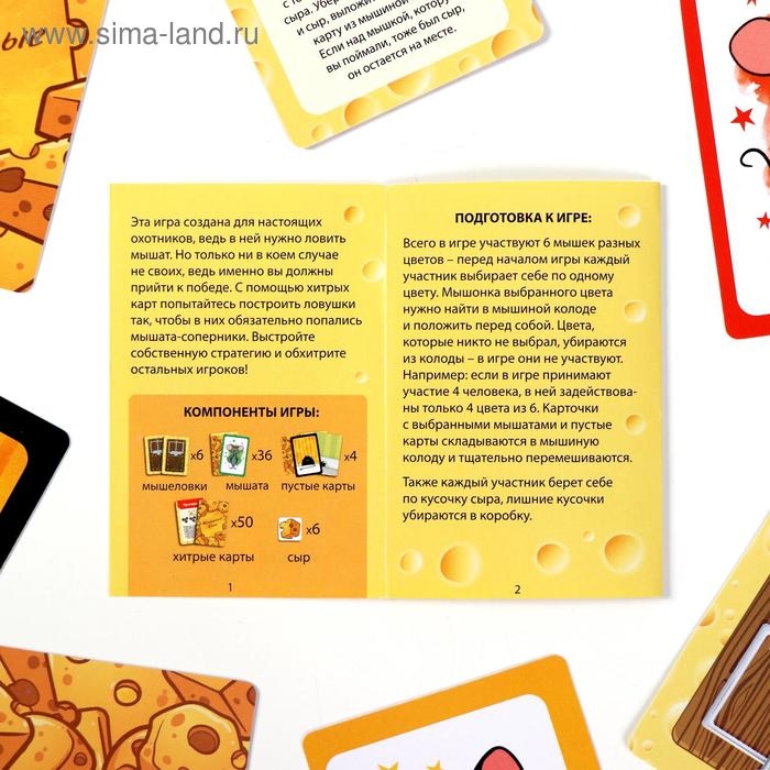 В игре могут участвовать 6 игроков. Перед началом игры каждый выбирает себе мышонка и берёт один кусочек сыра. Затем нужно разложить 96 разных карточек: мышеловки, мышата, пустые и хитрые карты. А теперь пора в бой!