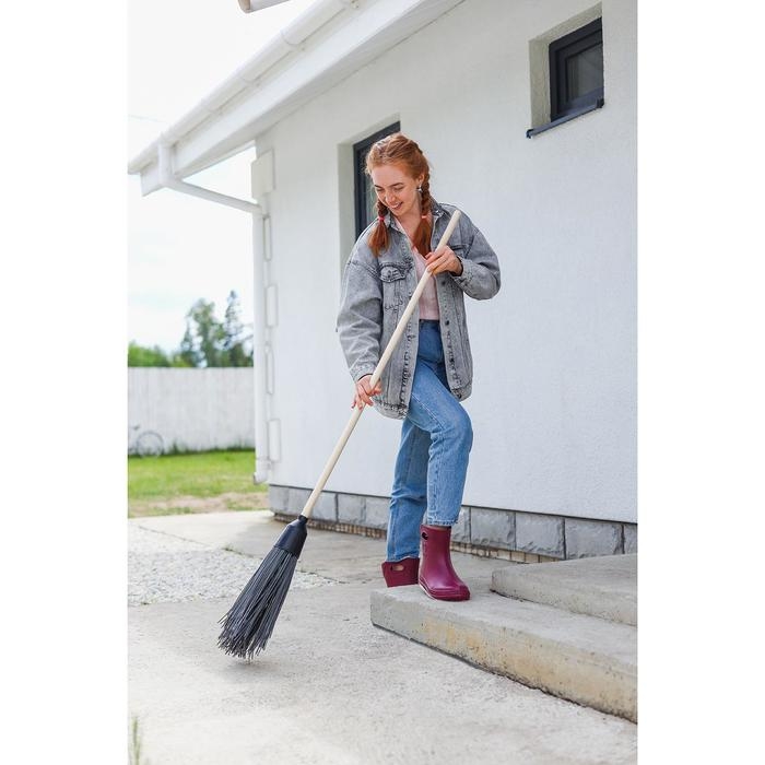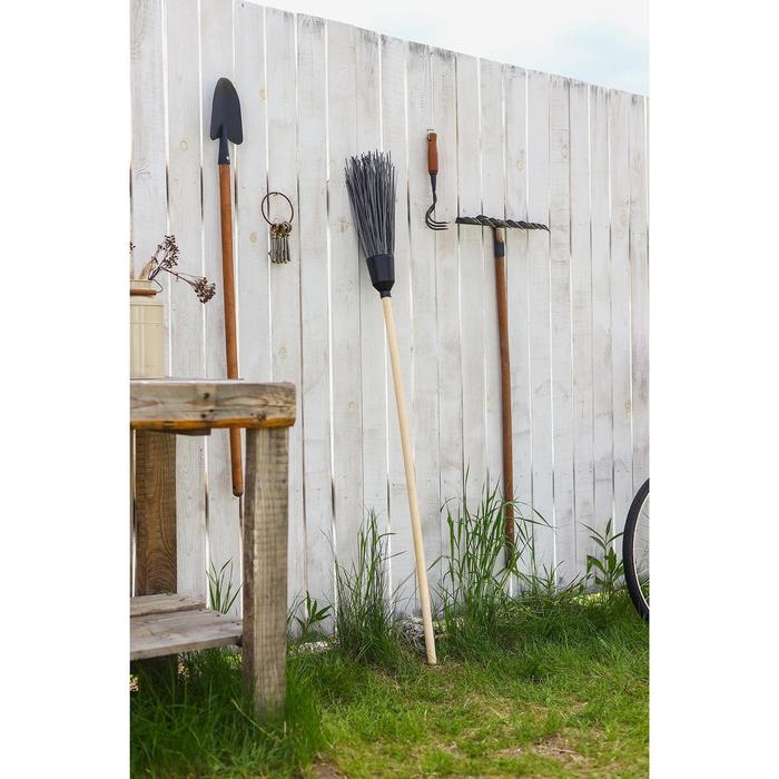 Метла подходит для уборки сухой и влажной листвы, снега, грязи и другого мусора. Инструмент состоит из пластиковой насадки и берёзового черенка. Если исключить контакт с щелочами и кислотами, то оно прослужит больше двух лет.