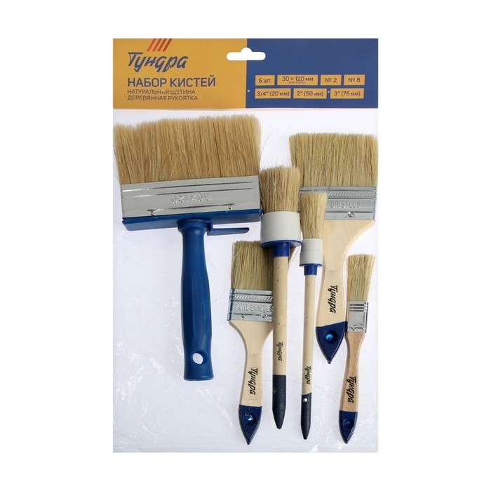 Набор кистей ТУНДРА, плоские 3/4", 2", 3", круглые №2, №8, макловица 30х120 мм, 6 шт.