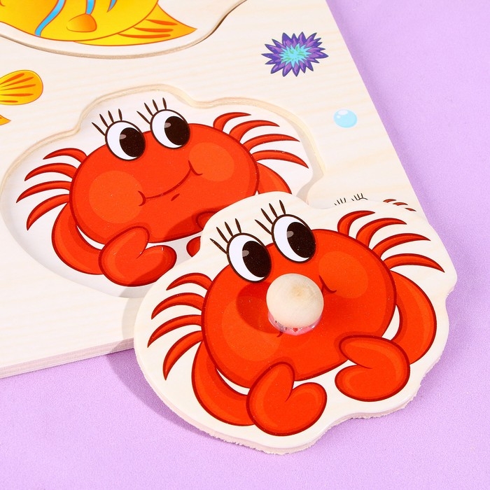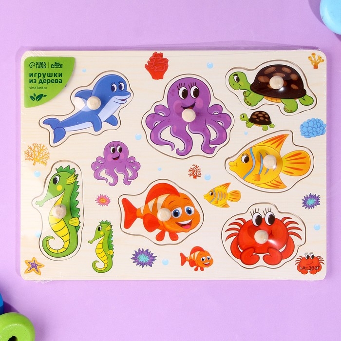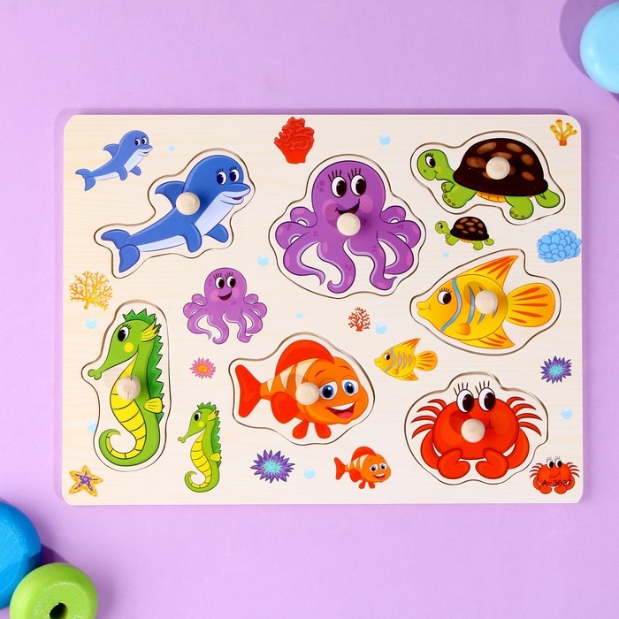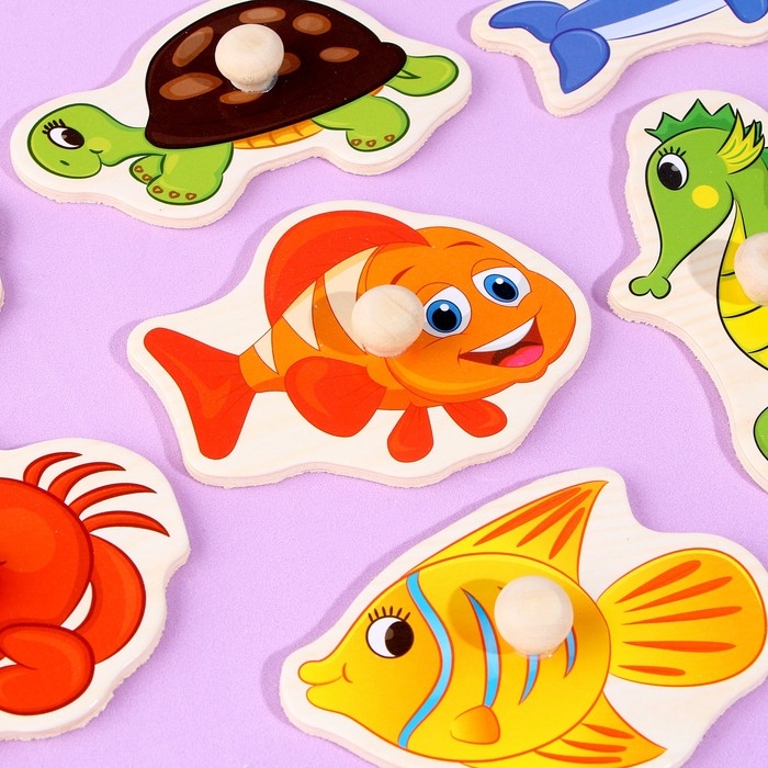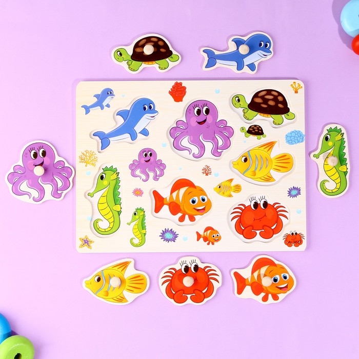 С помощью рамки-вкладыша ребёнок познакомится с обитателями подводного мира. Для большей продуктивности занимайтесь вместе с малышом, расскажите о среде обитания зверей и чем они питаются.