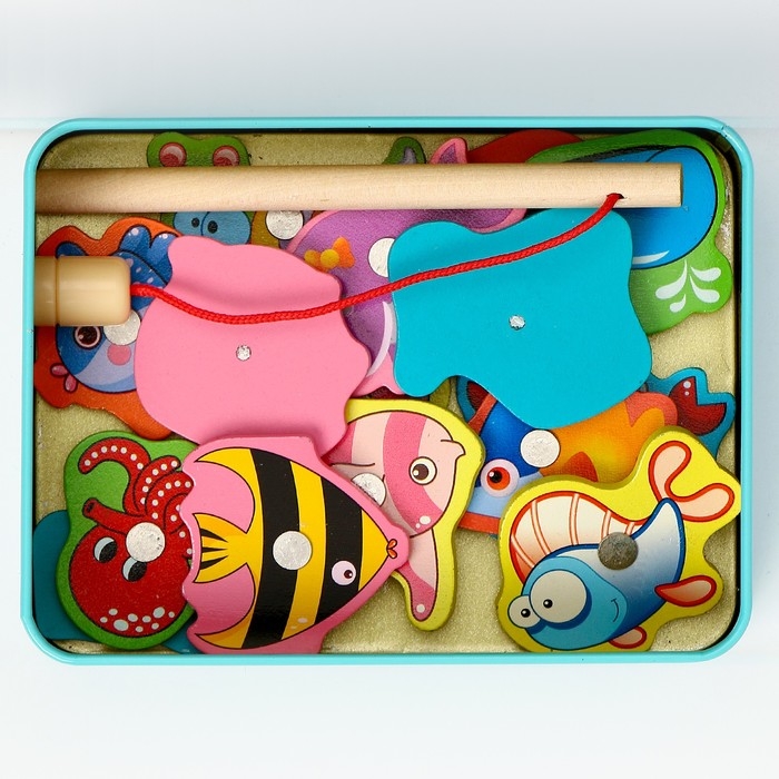 В наборе: 15 магнитных рыбок, удочка, металлическая коробка.