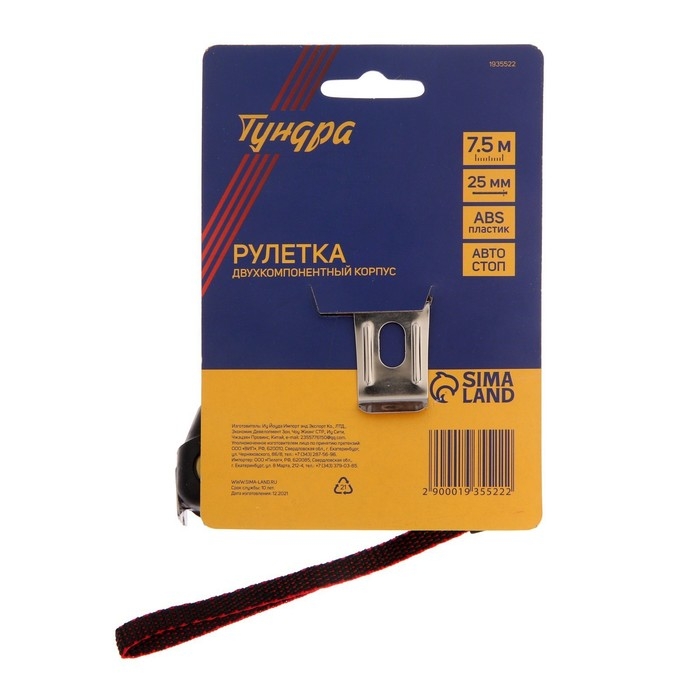 Рулетка ТУНДРА, двухкомпонентный корпус, автостоп, 7.5 м х 25 мм